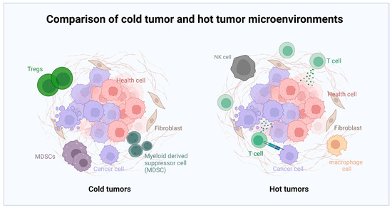 The microenvironments of ‘cold’ and ‘hot’ tumors greatly differ. Cold tumors usually lack effective T-cell infiltration and might lack tumor-specific antigens, making it challenging for the immune system to recognize and attack these tumors. Moreover, the microenvironment of cold tumors may be rich in immunosuppressive cells, such as regulatory T-cells (Tregs), M2 macrophages, and myeloid-derived suppressor cells (MDSCs). These cells further inhibit immune responses, enabling the tumor to more effectively evade the immune system’s attack. Besides, hot tumors typically exhibit substantial immune cell infiltration, particularly tumor-specific T-cells. These tumors usually possess many tumor mutation antigens, making them more easily recognized and attacked by the immune system. Besides T-cells, other immune cell infiltrations, such as B cells, NK cells, dendritic cells, and M1 macrophages, may also be present in hot tumors.