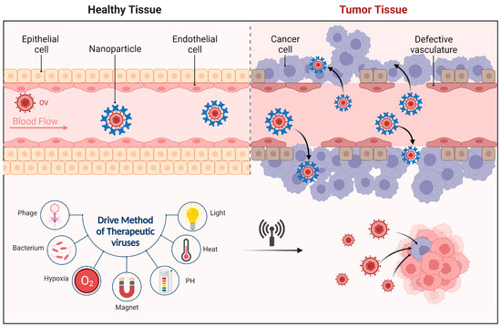 Although phages are not classified as OVs, their unique structure enables a novel anti-cancer therapy involving the combined use of phages and nanomaterials, which benefits from the strong affinity and high specificity of phage proteins. This specificity can increase drug concentration within tumor tissues, thereby enhancing therapeutic effects. For example, researchers have coupled phage proteins to nano-drugs via chemical bonds or physical adsorption, forming a composite structure. The phage proteins can guide the nano-drugs precisely to tumor cells, where the nano-drugs release anti-cancer drugs, achieving efficient therapeutic effects [92]. Overall, phage therapy has advantages in cancer treatment, such as strong targeting, low toxicity, and high customizability. However, it also points out some potential problems, like immune response, viral clearance, and drug delivery.