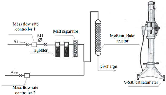 To initiate the absorption process of water vapor, the sample was exposed to argon gas passed through two Dreschel flasks containing distilled water (gas humidity 100%) (Figure 2). To eliminate the potential influence of the water vapor delivery rate on the external surface of Bu[6], a series of preliminary experiments were conducted using progressively increasing flow rates. Based on the experimental findings, a gas flow rate of 30 L·h−1 was selected as the optimal condition for the absorption process.