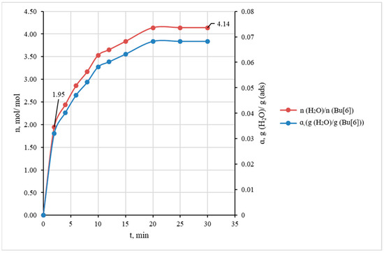 The kinetic curves of water vapor absorption expressed in terms of mass ratio g(H2O)/g(Bu[6]) and molar ratio n(H2O)/n(Bu[6]) (gas flow rate of 30 L·h−1).
