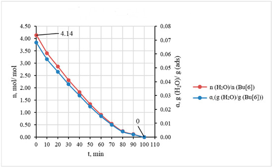 The kinetic curves of water desorption expressed in terms of mass ratio g(H2O)/g(Bu[6]) and molar ratio n(H2O)/n(Bu[6]) (gas flow rate 10 L·h−1).