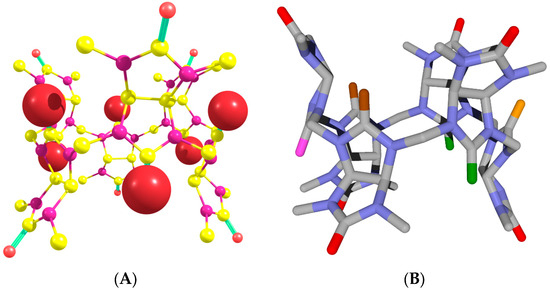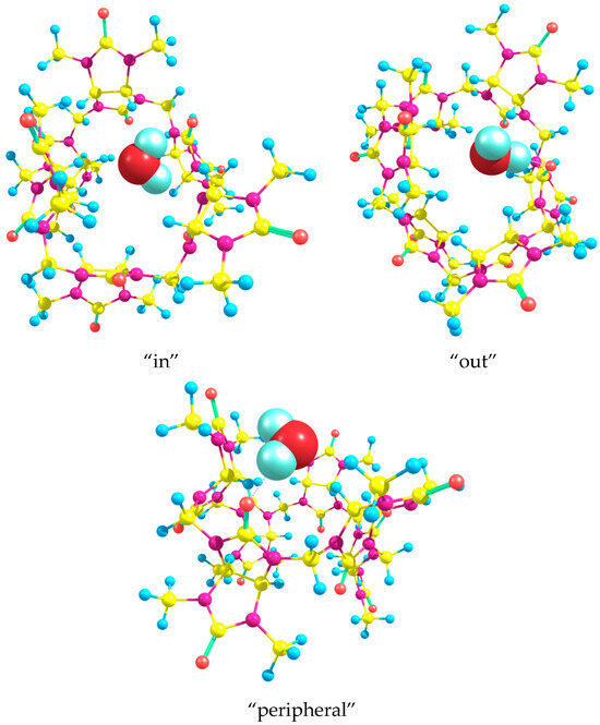 The geometry optimization of Bu[6] in the gas phase led to the structure shown in Figure 5. Within the Bu[6] molecule, six of the twelve carbonyl oxygen atoms are positioned at the molecule’s periphery, while the remaining six O atoms are located near the central plane of the twenty-four-membered macrocycle. Oxygen atoms of the latter type can be referred to as equatorial (Figure 5A).