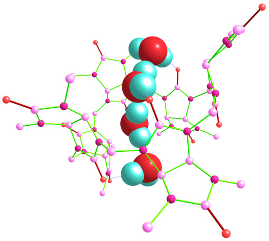 Trying to optimize the structures of trihydrate Bu[6]·3H2O with different relative positions and orientations of three water molecules bound to equatorial oxygen atoms, we obtained the energies of the corresponding aqua complexes varying within the interval of 4.54 kcal/mol. Among them, the out_out(s)_in(t) structure (Figure 8) had the lowest energy. It is noteworthy that the starting geometry before its optimization corresponded to the out_in(g)_in(t) arrangement and thus resembled a modification of the low-energy dihydrate out_in(g). However, during the optimization procedure, it was rearranged to out_out(s)_in(t).
