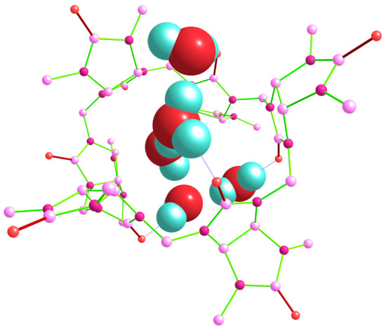 Finally, we tried to model several pentahydrate Bu[6]·5H2O structures, including those with branched and non-branched guest (H2O)5 clusters. The lowest energy after the DFT optimization corresponded to the structure classified as out_out(s)_w_out(t)_in(g) (Figure 10), which was based on the geometry of the lowest-energy tetrahydrate (see above).