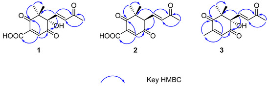 Norsescycldione C (3) was obtained as a yellowish oil with C13H16O4 (six degrees of unsaturation) using its HR-ESIMS data (m/z 259.0949 [M + Na]+, calculated for C13H16O4Na, 259.0946). Its 1D-NMR spectra (Table 1) showed three carbonyl groups [δC 207.1 (C-2), 202.6 (C-9), 195.6 (C-5)], two trans-double bond groups [δH 7.22 (1H, d, J = 16.1 Hz, H-7), 6.77 (1H, s, H-4), 6.41 (1H, d, J = 16.1 Hz, H-8); δC 146.2 (C-7), 144.2 (C-3), 136.0 (C-4), 134.1 (C-8)], one tertiary alcohol group [δC 99.3 (C-6)], and four methyl groups [δH 2.42 (3H, s, H-10), 2.26 (3H, s, H-11), 1.18 (3H, s, H-12), 0.95 (3H, s, H-13); δC 27.5 (C-10), 25.7 (C-12), 23.9 (C-13), 14.7 (C-11)]. A comparison of its 1D NMR data with Norsescycldione A indicated that they were very similar except for one less carboxyl group and one more methyl group, showing that compound 2 also possessed a norsesquiterpene skeleton similar to Norsescycldione A. In the HMBC spectrum (Figure 2), the key correlations of H-4/C-2, C-5, C-11; H-7/C-1, C-5, C-9; H-10/C-8, C-9; H-12/C-2, C-13; H-11/C-2 established its planar structure, which also proved that the missing carboxyl group was at the position of C-3 and the extra methyl group was attached to the position of C-3. In addition, the computed ECD curve of (6S)-3a matched well with the experimental result of 3 (Figure 3), establishing its stereochemical structure. Thus, the structure of 3 was confirmed and named Norsescycldione C (Figure 1).