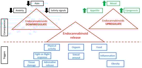 When physiological conditions are normal, the tonic activity of the ECS is minimal []. Any change in ECS tone (increase or decrease) is associated with various pathological states []. Figure 1 demonstrates that the release of endocannabinoids is triggered by various stimuli, such as physical activity, various stresses, food consumption, sexual behavior, orgasm, obesity, inflammation, tissue damage, and so on. Higher levels of endocannabinoids are connected with many consequences (Figure 1). In case of alterations in the concentrations of endogenous endocannabinoid ligands, receptor expression or activity, or endocannabinoid metabolic enzyme activity, various pathological conditions are observed [].