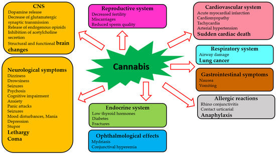 Adverse ophthalmological effects (mydriasis and conjunctival hyperemia) have been reported []. Cannabis use has been suggested to be linked to acute myocardial infarction, cardiomyopathy, and sudden cardiac death []. Additional effects of cannabis on the cardiovascular system are related to tachycardia and arterial hypertension []. Respiratory effects of cannabis have been studied in cases of acute cannabis consumption, and decreased airway resistance has been reported [,]. Chronic cannabis use has been linked to an increased risk for developing airway diseases and lung cancer [,]. Several studies have demonstrated gastrointestinal symptoms (nausea, vomiting, and thirst) after using cannabis [,]. Decreased fertility, miscarriages, reduced sperm function, lowering of thyroid hormones, and increased risk of diabetes and fractures can all be caused by the effects of cannabis and cannabinoids on the endocrine system []. Some compounds of cannabis can trigger various allergic reactions, such as rhinoconjunctivitis, contact urticaria, and anaphylaxis [].