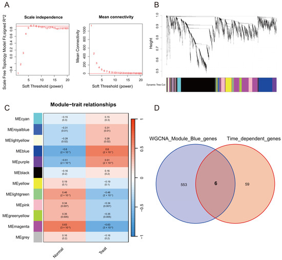 Weighted correlation network analysis (WGCNA) in GSE16561. (A) Relationship between the scale-free fit index and a range of soft-thresholding powers (left). Association between mean connectivity and diverse soft-thresholding powers (right). The scale-free fit index measures the degree of scale-free topology in the network. The mean connectivity indicates the overall connectivity pattern and density of the network. The soft-thresholding power is used to transform the co-expression similarity matrix into a weighted adjacency matrix. The results show that 6 is the optimal soft-thresholding power for the scale-free topology in the network. (B) Clustering dendrogram showing co-expression modules identified by WGCNA. (C) Heatmap showing the module-trait correlations and corresponding p values. (D) Venn diagram showing the six overlapping genes between WGCNA screened genes and maSigPro selected genes.