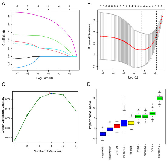 Identification of stroke biomarkers by machine learning. (A) Least Absolute Shrinkage and Selection Operator (LASSO) coefficient profiles at varying levels of penalization. (B) Screening of the optimal lambda with fivefold cross-validations. (C) A line graph depicting the sequential stages involved in biomarker screening by the Support Vector Machine Recursive Feature Elimination (SVM-RFE) algorithm. (D) Four genes with importance ranking were determined via the Boruta algorithm.