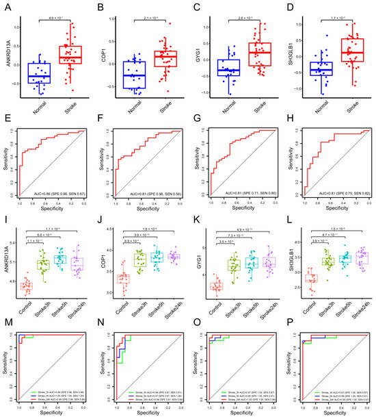 Classification performance of Ankrd13a, Cop1, Gyg1, and Sh3glb1 in GSE16561. (A–D) The box plots present the expression levels of the four feature genes between normal subjects and stroke patients in GSE16561. (E–H) Diagnostic efficiency evaluation of the four feature genes by receiver operating characteristic (ROC) curve in GSE16561. (I–L) The box plots show the expression levels of the four feature genes between normal subjects and stroke patients in GSE58294. (M–P) Diagnostic efficiency evaluation of the four feature genes by ROC curve in GSE58294.