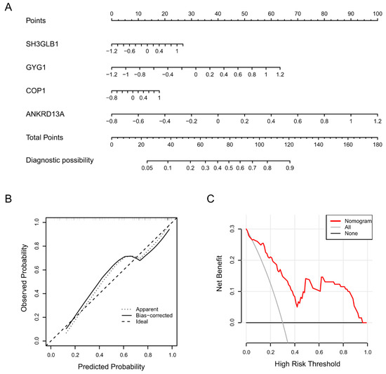 Nomogram model for predicting patients with stroke. (A) The visible nomogram was constructed using the four screened feature genes. (B) Calibration curve of the nomogram model. The x-axis portrays the predicted stroke risk. The y-axis illustrates the actual diagnosed stroke. (C) decision curve analysis (DCA) curves of the nomogram model. The black line represents the net benefit where none of the participants are assumed to suffer from stroke. Conversely, the light gray line represents the net benefit when all participants are assumed to suffer from stroke. The region bounded by the red line and the light gray line in the model curve signifies the clinical utility of the nomogram model.