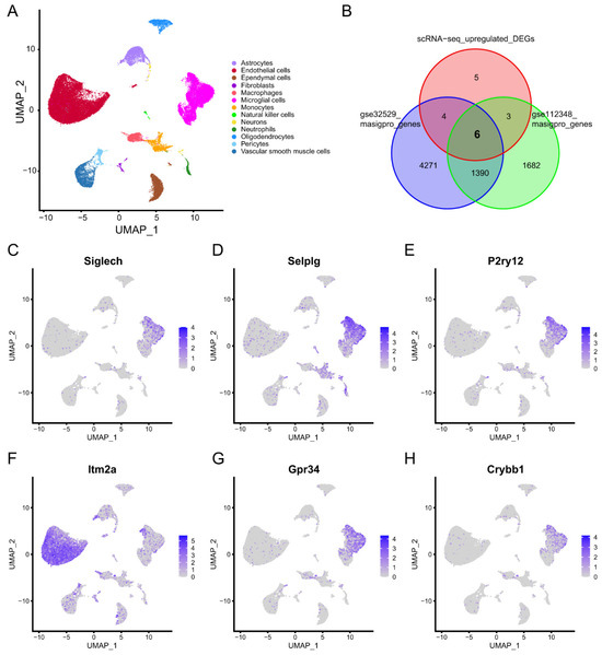 Single-cell RNA sequencing (scRNA-seq) profiles of normal and ischemic stroke mouse brains. (A) Uniform manifold approximation and projection (UMAP) plot showing the 13 identified cell types in scRNA-Seq. (B) Venn plot showing six overlapping genes between the scRNA-seq upregulated differentially expressed genes (DEGs) and time-dependent genes. (C–H) Feature plot showing the expression of the six overlapping genes.
