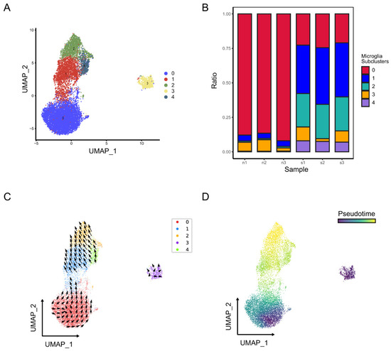 Identification of microglia subclusters in normal and ischemic stroke mouse brains. (A) UMAP plot exhibiting the five microglia subclusters. (B) The relative proportion of each subcluster of microglia in normal and ischemic stroke mouse brains. The RNA velocity (C) and pseudo time (D) of microglia are shown in the UMAP plots.
