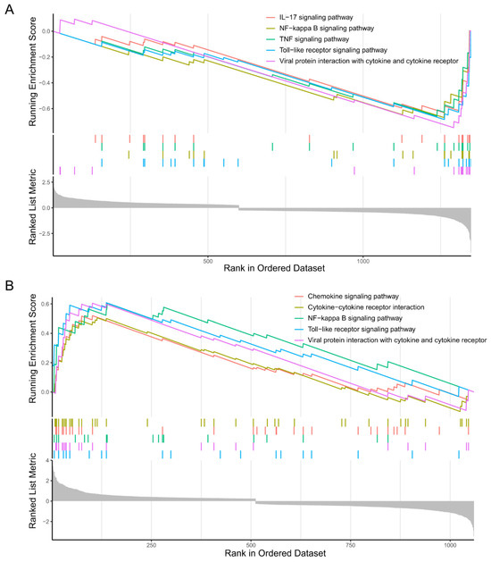 The GSEA results indicated that microglia subcluster 0 down-regulated the IL-17 signaling pathway, NF-kappa B signaling pathway, TNF signaling pathway, and Toll-like receptor signaling pathway (Figure 7A). On the contrary, microglia subcluster 2 upregulated the cytokine- cytokine receptor interaction, chemokine signaling pathway, NF-kappa B signaling pathway, and Toll-like receptor signaling pathway (Figure 7B).