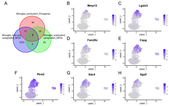 In order to find the key genes of microglia subcluster 2 that can not only be detected at the bulk RNA-Seq level but can also be examined at the scRNA-Seq level, we collected a dataset PRJNA687414 containing bulk RNA-Seq data of microglia cells. Subsequently, we intersected the upregulated DEGs of bulk RNA-Seq with the upregulated DEGs and driver genes of microglia subcluster 2. Finally, seven overlapping genes were obtained, including Mmp12, Lgals3, Fam20c, Capg, Pkm2, Sdc4, and Itga5 (Figure 8A). The UMAP plot showed that these genes were explicitly highly expressed in microglia subcluster 2 (Figure 8B–H).