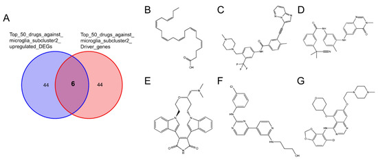 Connectivity map analysis. (A) Venn plot showing the six potential candidate compounds targeting microglia subcluster 2. The 2D structures of doconexent (B), ponatinib (C), AZ_628 (D), ruboxistaurin (E), CGP-60474 (F), and saracatinib (G).
