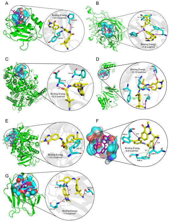 The interactions in the binding pockets between molecule AZ_628 and the seven target proteins were visualized by PyMol software (v2.5.5). (A) Mmp12, (B) Itga5, (C) Fam20c, (D) Capg, (E) Pkm2, (F) Sdc4, and (G) Lgals3.