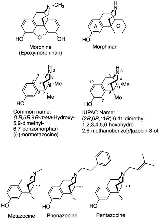 Molecular structures of morphine, morphinan, and the 6,7-benzomorphans-metazocine, phenazocine and pentazocine.