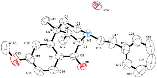The only reagent that was found to be successful for the separation of the enantiomers of 34 so that they could be clearly observed in their NMR spectra was 1-(anthracen-9-yl)-2,2,2-trifluoroethan-1-ol. The two peaks that were most resolved in the 1H-NMR spectra and that could be used for determining enantiomeric excess were the methyl doublet and the farthest down-field aryl signal. After a single recrystallization, an enantiomeric excess of >98% was achieved for both enantiomers (see Supplementary Materials for NMR spectra). With a successful resolution method, we needed to determine the absolute configuration of the two enantiomers. Although tartaric acid resolved rac-34 well, it did not provide a proper crystalline form for X-ray spectroscopic determination. A small amount of each enantiomer base was dissolved in acetone and seven drops of concentrated hydrobromic acid added. As the acetone evaporated under ambient pressure, colorless needles formed. The crystals of the HBr salt of (+)-34 were used for the X-ray crystallographic analysis (Figure 3). The crystal structure analysis confirmed both the overall structure and the absolute configuration for the enantiomeric compounds.
