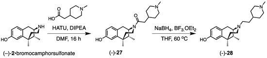 We then turned to a piperidine analog, a compound bearing a 1-methylpiperidin-4-ylethyl side chain. (−)-Normetazocine, as the bromocamphorsulfonate salt ((−)-2•bromocamphorsulfonate), was treated with 2-(1-methylpiperidin-4-yl)acetic acid using HATU as a coupling agent. The resulting amide 27 then underwent a borane reduction [24] to give the desired 1-methylpiperidin-4-ylethyl analog (−)-28 (Scheme 4).