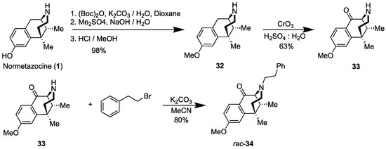 A large-scale synthesis and subsequent optical resolution of a C8-oxo key intermediate (rac-2′-methoxy-8-oxo-N-phenethylnormetazocine, rac-34) was undertaken to obtain the starting material for the synthesis of alkenyl and alkyl substituents at that C8 position. The synthesis of the 2′-methoxy racemate rac-34 proceeded according to the literature [25,26] (for the comparable phenol), in good overall yield via a three-step process from normetazocine (1) (Scheme 6). Boc protection of the secondary amine in normetazocine, followed by methylation of the phenol and subsequent removal of the Boc group, provided 32 in 98% yield. The C8 position was oxidized using chromium trioxide to form the ketone 33 (63%). Finally, the key intermediate, rac-34, was synthesized via N-alkylation of the 8-oxo-2′-methoxy-normetazocine (34) with phenethyl bromide in high yield (80%). The ketone in 34 was found to be resistant to olefination under Wittig or HWE conditions as well as with oxo-nucleophiles. It did, however, react with organometallics such as alkyl lithiates and Grignard reagents.
