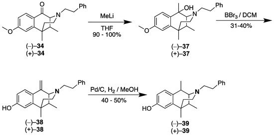 The C8-hydroxy compounds were synthesized from the resolved N-phenethyl C-8 ketones (−)- and (+)-34 using lithium aluminum hydride to give the phenolic ethers (−)- and (+)-35 (Scheme 8). O-Demethylation with BBr3 gave the desired phenols (−)- and (+)-36.