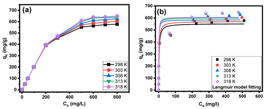 Figure 6a and Figure 7a illustrate the impacts of the initial concentration and solution temperature of the CV dye on its sorption by PPAC and S-PPAC. At different temperatures, the adsorption capacities of PPAC and S-PPAC increase linearly in concentration ranges of 25 to 200 mg/L and 25 to 300 mg/L, respectively. This shows that the CV dye was totally eliminated at this concentration range. At concentrations higher than 200 mg/L for PPAC and 300 mg/L for S-PPAC, the adsorption capacity continues to increase with increasing concentration and temperature. The observed behaviors can be explained by the presence of a significant driving force during the adsorption process, which is characterized by high initial concentrations. The saturation adsorption of CV dye onto PPAC approaches a condition of near-constancy at 600 mg/L, while S-PPAC reaches equilibrium at 700 mg/L. This shows that S-PPAC has more adsorption sites on its surface than PPAC. At a concentration of 800 mg/L for the CV dye, the maximum adsorption capacities are 578, 604, 626, 640 and 650 at 298, 303, 308, 313 and 318 K, respectively, for PPAC. In contrast, the adsorption capacities are 706, 720, 754, 790 and 810 mg/g at 298, 303, 308, 313 and 318 K, respectively, for PPAC. This behavior indicates that the adsorption process is an endothermic process, and its increase facilitates the penetration of the dye into the pores of PPAC and S-PPAC.