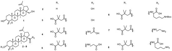 Betulin (1), betulinic acid (2), bevirimat (3) and its early stage analogs (4–8).