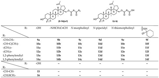 A search for new methods of antiviral therapy has been primarily focused on the use of substances of natural origin. Recently, a synthesis of a novel series of betulinic acid ester derivatives (9–14)(a–f) and 15–16 (Figure 2) was published [28]. The structures of the novel compounds were established, and the compounds were tested against DNA and RNA viruses, for antiviral activity against several types of viruses, including HSV-1 [28]. Antiviral experiments and monitoring of the time of addition of the active compound confirmed a research hypothesis and showed high antiviral effect of several derivatives against BEV, H1N1, and HSV-1. Compound 10d exhibited 6-fold more potent activity against HSV-1 (EC50 = 17.2 µM) than the reference drug (acyclovir; EC50 = 111.1 µM) (Table 2). Compound 13e possessed the highest selectivity index (SI = 11.8) even when compared with that of acyclovir (SI = 14.0). Overall, all active compounds showed high virus-specific activity, as none of them showed activity in more than one virus. Most of the active compounds were active at the later steps of the replication cycle. This finding resulted in a suggestion of a mode of action during the step of nucleic acids/protein synthesis, assembly, or maturation. The in silico study was in good agreement with the in vitro data, confirming a high affinity of 10d to HSV-1 DNA polymerase. In addition, all ester and amide derivatives were tested for antiproliferative activity in A549 and MDCK (Madin-Darby canine kidney) cell lines (Table 3). Ester derivatives in the series of (9–14)(a–f) and 15–16, glutaric acid amides 11c and 11d, and succinic acid amides 9b and 9c showed high cytotoxicity values. These findings provided valuable data for further investigation of the active compounds, and for a subsequent betulin derivation to design novel compounds having higher potential to display antiviral activity. The results indicated that natural resources have still been one of the most important sources of priority structures in a search for new drug candidates.