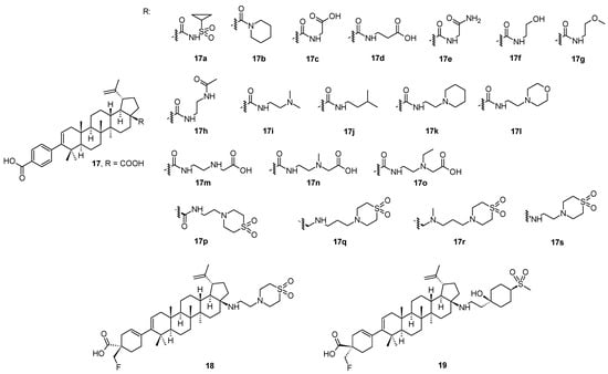 The investigation of the structure-activity relationships of a series of HIV-1 maturation inhibitors based on the compound 17s (Figure 3) continued by the subsequent incorporation of novel C-17 amine substituents to reduce the overall basicity of the target compounds [47]. A replacement of the amine group on the C-17 side chain present in 17s with a tertiary alcohol in combination with either a heterocyclic ring system or a cyclohexyl ring substituted with polar groups provided potent wild-type (WT) HIV-1 maturation inhibitors. They also preserved excellent potency against a T332S/V362I/prR41G variant, a laboratory strain that served as a substitute to assess HIV-1 polymorphic virus characteristics [47]. Compound 19 exhibited a broad anti-HIV-1 activity against relevant Gag polymorphic viruses, and displayed the most desirable overall profile in this series of the studied compounds. In pharmacokinetic studies, 19 had low acquittal and exhibited sufficient oral bioavailability in rats and dogs.