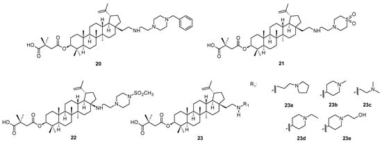 Structurally similar compounds to those mentioned above [46,47,48] were reported recently as second-generation maturation inhibitors (compounds 20–22 and 23a–23e; Figure 4), displaying effect higher than bevirimat (3) against HIV-1 subtype C [49]. In silico studies on the interaction of bevirimat and their analogs have been limited to HIV-1 subtype B (5I4T) due to the lack of an available 3D structure for HIV-1 subtype C virus. The authors [49] have developed a 3D model of the HIV-1C Gag CA-SP1 region using protein homology modeling with HIV-1 subtype B (514T) as a template. The generated HIV-1 C homology model was extensively validated using several tools and served as a template to perform molecular docking studies with eight well-characterized maturation inhibitors. The docked complex of HIV-1C and the studied maturation inhibitors were subjected to molecular dynamics simulation for 100 ns. Based on the obtained data, it was revealed that the investigation was probably a pioneering report on the construction and validation of a 3D model for the HIV-1C Gag CA-SP1, which could serve as a crucial tool in the structure-aided design of novel and well-acting maturation inhibitors [49]. The docking studies confirmed that modifications at the C-28 carbon centers in bevirimat analogs resulted in increased interactions with HIV-1C Gag CA-SP1 and higher binding energy as compared to the parent bevirimat (3), which may have conferred antiviral activity to these analogs [49]. The authors [49] presented no antiviral activity data, however, the in silico investigation brought a novel motivation in designing more effective antiviral agents for the next generations. However, antiviral activity data of several compounds of the investigated series can be found in [46].