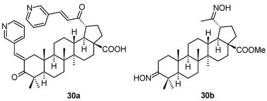 The chalcone derivatives of 20-oxo-lupanes have been synthesized and screened for several types of biological activity by Russian authors [55]. Investigating the antiviral activity of the prepared series of compounds, two of them, 30a and 30b (Figure 9), were evaluated as compounds displaying anti-HSV-1 activity (Table 11). The antiviral activity of 30a and 30b was tested against HCMV, and that of 30b also against HSV-1 and HPV.