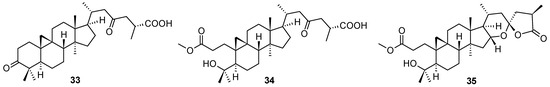 Several so far undescribed cycloartane triterpenoids, pseudolarnoids A−G, together with other known triterpenoids, were isolated from the seeds of Pseudolarix amabilis (J. Nelson) Rehder [58]. Their structures were elucidated on the basis of spectroscopic analysis, X-ray crystallography, and ECD data. Three of these natural products (33–35; Figure 12) proved their ability to display potent antiviral effects on HSV-1 in vitro (Table 13). Based on the therapeutic index values, structures 34 and 35 showed a better therapeutic profile than 33 (Table 13). The structures of other less active or inactive cycloartane triterpenoids are not shown, they can be found in the original paper [58].