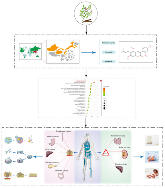 Due to the limitations of traditional pharmacological assays, the complex composition, numerous targets, and unclear mechanisms of natural drugs have been stumbling blocks for in-depth studies, but the new rise of mass spectrometry and purification and extraction techniques offers a convenient way to unravel the mysteries of the mechanism of action of natural drugs. Glycyrrhiza’s active ingredients are complex, with about 400 compounds obtained from the roots, which are classified as flavonoids, therapeutic agents, and coumarins, including glycyrrhizic acid, glycyrrhetinic acid, liquiritin, liquiritigenin, licoricchalcone, glycycoumarin, and others. These active ingredients exert a wide range of pharmacological effects, such as anti-inflammatory, anti-viral, antioxidant, and immune-modulating effects, among which anti-tumor effects should not be underestimated. As a natural plant of “medicinal food” origin, glycyrrhiza is both a “sensitizer” for chemotherapy drugs, for example by enhancing the efficacy of cisplatin and 5-fluorouracil, and an “attenuator” for radiotherapy modalities, improving liver damage, reducing nephrotoxicity, and alleviating enterotoxicity. A comprehensive review of the effect of glycyrrhiza on digestive tumors is still lacking, so this paper is a summary. A flowchart of the full paper is shown in Figure 2.