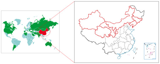 Distribution of glycyrrhiza in world and China. Green areas represent areas where three kinds of glycyrrhiza are grown, red represents China, and red lines represents areas where three kinds of glycyrrhiza are grown in China.