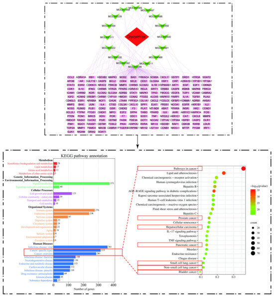 Natural plant-based medicines are characterized by complex compositions, diverse targets, and unknown mechanisms of action, which cannot be comprehensively studied and explored by conventional pharmacological methods. With the new emergence of the discipline of “pharmacology”, the research of natural plants has been fast-tracked and their mysteries are expected to be unveiled. Network pharmacology is a new discipline that uses network analysis of biological systems to select specific signaling nodes for the design of multi-target drug molecules [38]. We used the Traditional Chinese Medicine Systems Pharmacology Database and Analysis Platform (TCMSP, https://old.tcmsp-e.com/tcmsp.php (accessed on 15 June 2023)) to search for potential targets of active ingredients. This is a database containing information such as pharmacokinetics, potential targets, and diseases for a large number of compounds. We set the parameters to DL ≥ 0.18 and OB ≥ 30% and finally obtained 16 active ingredients and 200 action targets. To investigate the effects of glycyrrhiza targets on diseases and physiopathology, 200 targets were enriched and analyzed using the STRING database (https://cn.string-db.org/ (accessed on 15 June 2023)), which can analyze protein–protein interactions. The results showed that the key active ingredient of glycyrrhiza had a pharmacological effect primarily on tumors, including prostate, liver, pancreatic, and lung cancers, as shown in Figure 5. Based on the enrichment results, we summarized the mechanisms of “potentiation” and “toxicity reduction” of glycyrrhiza active ingredients against tumors, as shown in Figure 6.