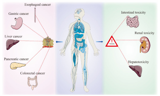 Tumors remain one of the leading causes of mortality worldwide, and the dangers of digestive tumors should not be underestimated. Tumors of the digestive system are those which exist between the esophagus to the anal canal and include tumors of the esophagus, stomach, liver, gallbladder, pancreas, colorectum, etc. [1,2]. In the 2020 Global Cancer Epidemiology Survey, the top two countries in the incidence or mortality caused by cancer account for about 61% [3], showing that they seriously endanger human life and health while putting enormous economic pressure on society. Currently, the treatment of gastrointestinal tumors is related to the diagnostic grading and clinical stage of the disease, among other factors. Surgery combined with lymphadenopathy can be used at an early stage to inhibit the progression of the tumor, but due to the state of diagnostic techniques, economic capacity, and disease awareness rates, the first diagnosis in most patients is made much later than the appearance of clinical symptoms, which is one of the main reasons for missing out on the best surgical options. Therefore, chemotherapy has become the dominant measure for intermediate- and late-stage tumors. Although chemoradiotherapy has an inhibitory effect on some tumors, due to the toxic and side effects of drugs, it affects all organ systems and may cause acute and permanent damage, as well as common symptoms, including nausea, vomiting, diarrhea, severe anemia, neurotoxicity, etc. Many patients are intolerant of adverse reactions, leading to interruption of treatment and affecting the efficacy [4,5,6,7]. Therefore, it is of great clinical importance to explore new therapeutic modalities.