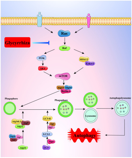 Glycyrrhizic acid and glycyrrhetinic acid are both triterpenoids, with glycyrrhetinic acid playing a major role in exerting pharmacological effects. Autophagy, a common way for tumor cells to escape and resist death, has a double-edged effect. In environments such as hypoxia and starvation, protective autophagy can be triggered to speed up the process of material and energy recycling and metabolism through the action of lysosomes, helping the cell survive dangerous periods; however, over-activated autophagy can inhibit tumor growth, so this process is also known as “programmed death type II” [71]. During autophagy, LC3 is sheared, processed, and modified by a ubiquitin-like system under the action of Atg7 and Atg3 molecules to form LC3-II in lipid form and bind to the bilayer membrane of autophagic lysosomes, so LC3-II is regarded as an important molecular marker of autophagy, and its content is proportional to the degree of autophagy. Both glycyrrhizic acid and glycyrrhetinic acid were shown to induce autophagy in hepatocellular carcinoma cells, and the mechanism of action may be related to the up-regulation of p-ERK1/2 expression and the promotion of LC3-II binding in autophagic lysosomal membranes [72,73], as shown in Figure 9.