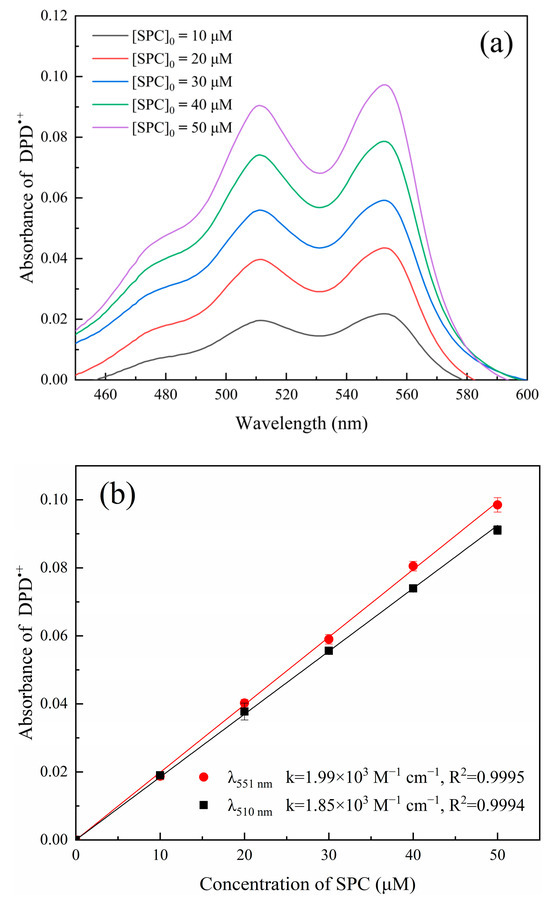 An amount of 10 mL of phosphate buffer solution (PBS) (125 mM, pH 3.50), 5 mL of DPD solution (20 mM), 5 mL of ferrous sulfate solution (2.5 mM), and 5 mL of SPC solution (0–250 μM) were mixed together and reacted for 4 min, and then the mixed solution was transferred into a 1 cm cuvette. The mixed solution without SPC was used as a reference. The absorbance values of the samples at wavelengths of 510 nm and 551 nm were measured via UV-Vis spectrophotometry (SPECORD 200, Analytik Jena AG, Jena, Germany), and all experiments were repeated three times. The calibration curve was found to be between the SPC concentration and the absorbance value of DPD•+. SPC concentration can be calculated according to Equation (13) by taking the detected wavelength of 551 nm, for example: