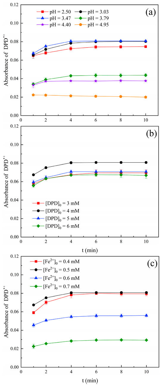 It has been reported that pH value had an important impact on the generation process and stability of the DPD•+ [16]. The precipitation of iron hydroxide is formed when pH ≥ 5.0 [18]. Therefore, the effect of solution pH value on DPD•+ absorbance was investigated in this paper and the results are shown in Figure 2a. The absorbance increased when the pH value increased from 2.50 to 3.47. This was because H+ can react with ∙OH under strongly acidic conditions (pH < 3), resulting in a decreasing amount of ∙OH available for the oxidation of DPD; therefore, the production of DPD•+ was reduced [19]. The absorbance value decreased when the pH value increased from 3.47 to 4.95. This was determined by the existing forms of iron species. Fe2+ could easily be converted into Fe(III), and the reaction rate of Fe(III) with H2O2 (0.01 M−1 cm−1, Equation (4)) was far lower than that of Fe2+ with H2O2 (76 M−1 cm−1) with the increase in the pH value [20]. Therefore, we can infer that the amount of Fe2+ used to activate SPC became less, which reduced the production of ∙OH and ultimately led to the formation of less DPD•+. Therefore, the optimal pH value was 3.50, and the optimal reaction time was 4 min since the absorbance of DPD•+ tended to be stable as of 4 min.