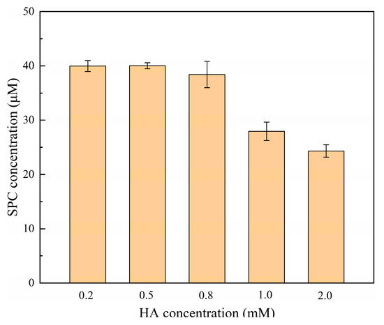As can be seen from Figure 4, HA at a concentration less than 0.8 mM had little effect on the determination of SPC, and the HA in the concentration range of 1–2 mM had great interference with the determination of SPC. This was because the high concentration of HA could compete with DPD for ∙OH generated from the decomposition of SPC, thus reducing the formation of DPD•+ (Equation (11)) [26]. As a result, this approach worked well for the analysis of SPC with HA less than 0.8 mM.