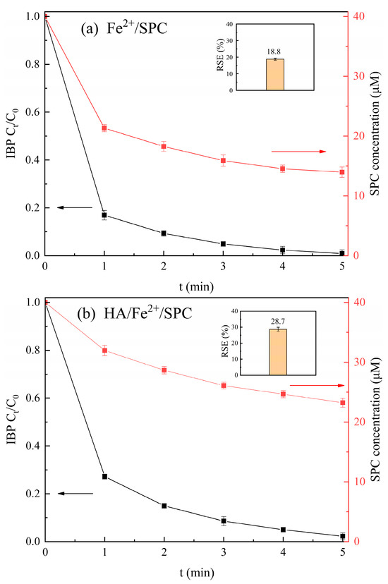 The degradation of ibuprofen and decomposition of SPC in the Fe2+/SPC system (a) and the HA/Fe2+/SPC system (b). (a) [Fe2+]0 = 0.5 mM, [SPC]0 = 40 μM, and [ibuprofen]0= 5 μM. (b) [Fe2+]0 = 50 μM, [SPC]0 = 40 μM, [HA]0 = 0.1 mM, and [ibuprofen]0= 5 μM). pH value = 3.00 in the IBP degradation systems and pH value = 3.50 in the SPC concentration measurement. The inset indicates the calculated RSE values (%).