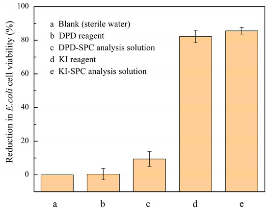 Reduction in E. coli cell viability via Fe2+/SPC-DPD spectrophotometry and iodometric spectrophotometry methods. (a) sterile water; ((b) DPD reagent. [DPD]0 = 4 mM; (c) DPD-SPC analysis solution. [DPD]0 = 4 mM, [SPC]0 = 40 μM, [Fe2+]0 = 0.5 mM, pH value = 3.50, and t = 4 min; (d) KI reagent. [KI]0 = 0.8 mM; and (e) KI-SPC analysis solution. [KI]0 = 0.8 mM and [SPC]0 = 40 μM. T = 25 °C).