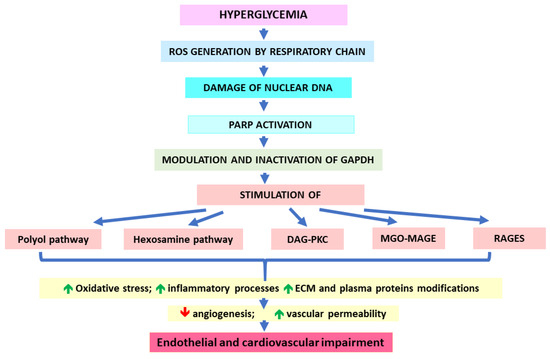 As proposed by Brownlee and Giacco [30,132,137], all five pathological pathways mentioned above (polyol, hexosamine, DAG-PKC, MGO-MAGEs, and RAGEs) are initiated by the generation of hyperglycemia-induced ROS by the mitochondrial respiratory chain. Enhanced reactive oxygen species would damage nuclear DNA, which in turn, would activate PARP. Subsequently, active PARP would modify GAPDH via ADP-ribosylation (using NAD+). This would lead to the inhibition of GAPDH and the obstruction of glycolytic pathway at triose level. Consequently, the accumulation of the above-mentioned side products and their detrimental effects are observed (Figure 2). Because most of these pathological pathways further stimulate ROS generation, the auto-augmentation of such routes would deepen the metabolic disturbances in the vicious circle mode. This mechanism seems to be similar in the case of both micro- and macrovascular complications. However, the causative relationship between hyperglycemia and cardiovascular disorders is not so obvious as in the case of microvascular complications [72]. Actually, CVDs seem to be more conditioned by insulin resistance, which (due to the lack of insulin-mediated inhibition) stimulates the release of free fatty acids (FFAs) from the adipose tissue. These FFAs are taken up by endothelial cells and undergo (uncontrolled by insulin) excessive β-oxidation yielding the substrates for the respiratory chain. Consequently, as in the case of hyperglycemia-conditioned accelerated aerobic glycolysis, excessive ROS production is observed, which triggers most of the pathological pathways discussed earlier [137,138].