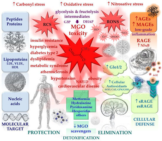 Methylglyoxal (MGO) is the major compound belonging to α-dicarbonyl molecules, which are termed “reactive carbonyl species” (RCS) responsible for “carbonyl stress”. They are highly reactive compounds that easily modify biological macromolecules, including peptides, proteins, lipoproteins, and nucleic acids via the generation of advanced glycation end products (AGEs) [1]. Therefore, together with other irritable molecules like reactive oxygen and nitrogen species (RONS), they disturb the functioning of cellular organelle, thus stimulating their rearrangements, leading to autophagy, apoptosis, or proliferation of cells. Such phenomena, when not counteracted by detoxifying mechanisms, stimulate oxidative stress and enhance inflammatory processes, contributing to the development of a variety of pathological conditions [1,2,3].