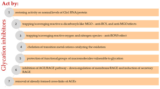 Several therapeutic approaches are considered to reduce or prevent MGO-induced toxicity (Figure 3 and Figure 4). The first is an activation of the glyoxalase system (Glo1/2). However, this approach is limited to conditions in which the amount of enzyme or glutathione is insufficient. Unfortunately, we currently do not know of many inducers of glyoxalase. The reduced activity of Glo1 is restored, for example, by candesartan [207,208] and pyridoxamine [209]. The scientific literature also more extensively describes this effect for a combination of two plant polyphenols trans-resveratrol, and hesperetin (tRES-HESP, a combination of stilbenoid and flavonoid, respectively) [210,211]. However, no effect on Glo1 was confirmed for the other flavonoid isoquercitrin (=quercetin-3-O-glucoside) [212]. Nevertheless, glycation inhibitors are usually characterized by more than one mechanism of action determining the overall anti-AGE potential. Further strategies assume that highly reactive MGO can be neutralized by mechanisms independent of the glyoxalase system, such as uptake (chemical binding) using small molecules, contributing to its removal from the extracellular and intracellular environment. The uptake of MGO in statu nascendi is thought to prevent its direct toxicity but also to reduce glucotoxicity induced by ROS and RNS (together known as RONS), the formation of AGEs, and the interaction of AGEs with the transmembrane receptor, RAGE. The binding of AGEs to RAGE on the surface of cells, including immune, endothelial, and vascular smooth muscle cells or platelets, induces an intracellular response to carbonyl stress, oxidative stress, and nitrosative stress, characterized by the activation of transcription factors such as NF-κB. Vascular wall stress induced by RCS and RONS is characteristic of atherosclerosis, and the resulting activation of NF-κB and MAPK systems may be a possible mechanism for AGE-induced angiopathy [213,214,215]. The excessive production of RONS generates a flux of reactive carbonyls, whose accumulation is positively correlated with the development of autophagy [215]. In this context, a strategy oriented toward the molecular cascade of the AGE-RAGE axis, or more accurately the MAGE-RAGE axis, opens up a new pharmacological approach [216,217].