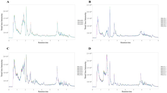 (A) Total ion chromatograms (TICs) of the QC samples. (B) TICs of the CS samples. (C) TICs of the CM samples. (D) TICs of the CC samples.