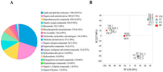Metabolomics profiles of CS, CM, and CC. (A) Classification of the annotated metabolites in CS, CM, and CC. (B) Principal component analysis (PCA) results show metabolite profile differences between and within groups.