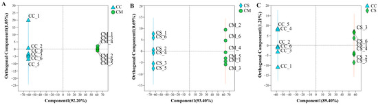 OPLS-DA score plots. (A) CC vs. CM. (B) CS vs. CM. (C) CC vs. CS. Comp1 first predicted principal component explanatory degree, orthogonal comp1 first predicted orthogonal component explanatory degree.