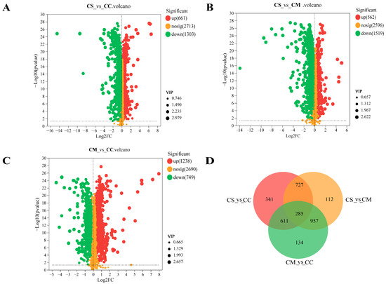 Differential metabolites of three species of Cordyceps. (A) Volcano plot of differential metabolites between CS vs. CC. (B) Volcano plot of differential metabolites between CS vs. CM. (C) Volcano plot of differential metabolites between CM vs. CC. (D) Venn plot of the number of differential metabolites among three comparison groups.